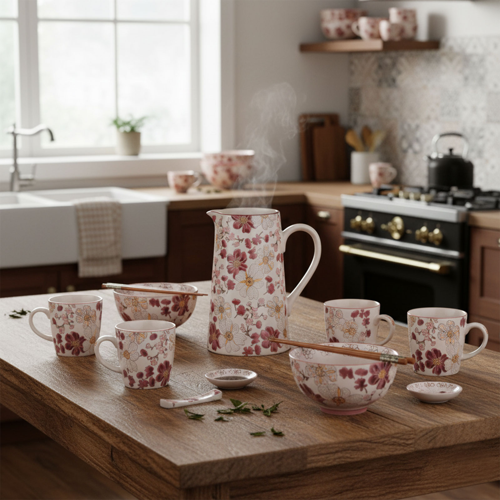 Ce pichet arbore un design floral délicat sur un fond crème, créant une esthétique intemporelle et raffinée. Les motifs de fleurs aux teintes bordeaux et de petites fleurs roses sont répartis avec une grande harmonie sur toute la surface de la céramique. L’anse incurvée et le bec verseur fin ne sont pas seulement fonctionnels ; ils contribuent à l’élégance rustique de l’ensemble, permettant de servir vos boissons avec une grâce naturelle. Ce style évoque une atmosphère douce et printanière, imprégnée de fraîcheur et d’un lien profond avec la nature.
