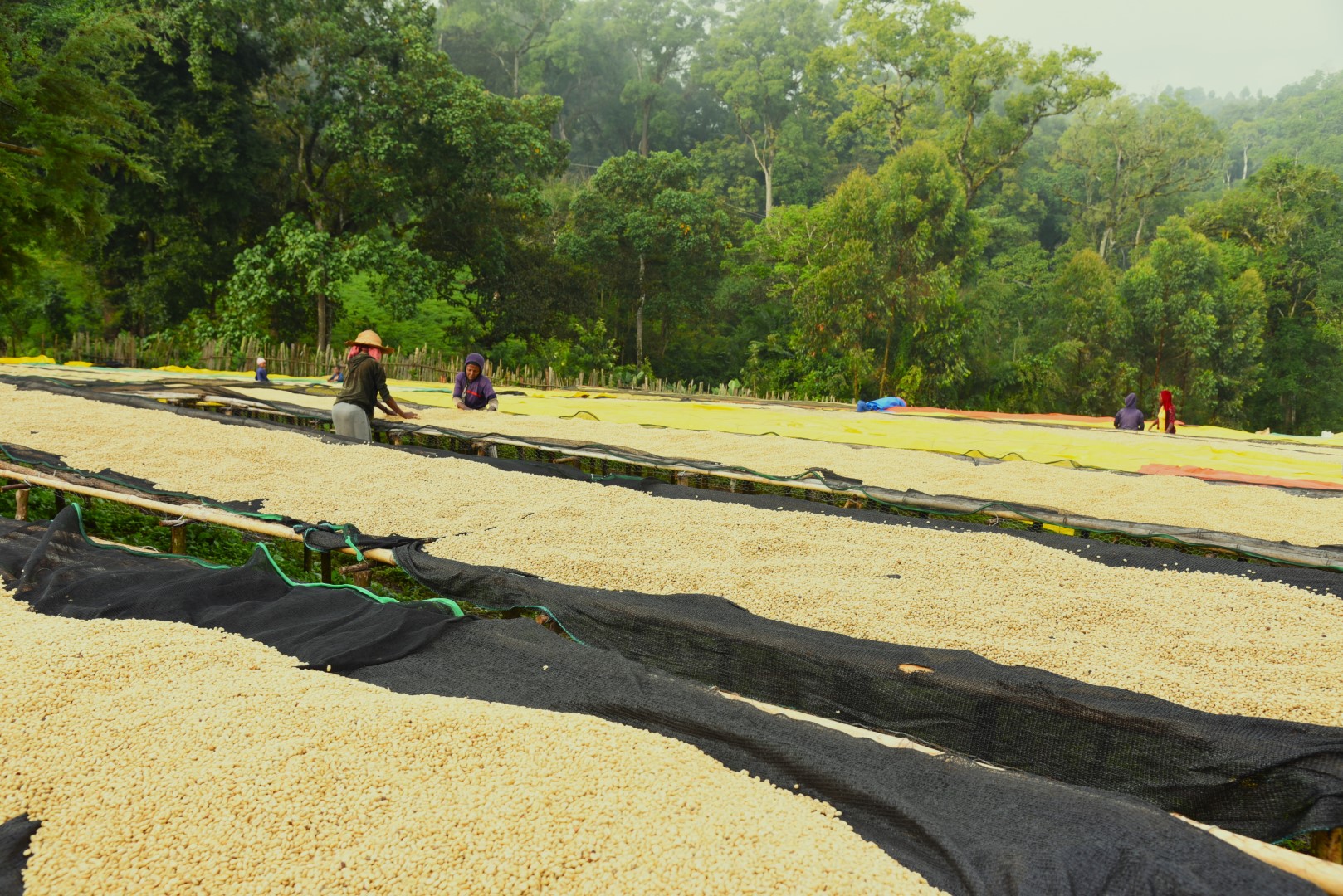 Le Bonga Forest est un café naturel, c’est-à-dire que les cerises sont séchées intactes avant d’être dépulpées. Ce processus commence par une récolte manuelle, effectuée entre novembre et janvier. Chaque cerise est soigneusement sélectionnée afin de ne conserver que celles ayant atteint une maturité parfaite. Une fois récoltées, les cerises sont placées sur des lits surélevés pour sécher sous le soleil pendant trois semaines. Ce séchage lent permet une fermentation naturelle qui développe des arômes profonds, caractéristiques des cafés naturels de haute qualité. Durant ces trois semaines, les cerises sont retournées régulièrement pour assurer un séchage homogène, essentiel pour préserver la qualité du grain.