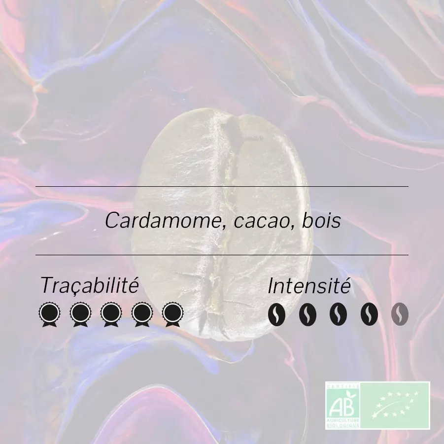 Ces notes aromatiques sont le reflet du terroir exceptionnel et du processus de traitement spécifique de ce grain. La cardamome apporte une touche épicée et légèrement florale, le cacao évoque une profondeur gourmande et légèrement amère, tandis que la note boisée confère une sensation de structure et de chaleur. Ensemble, ils créent une symphonie de saveurs qui caractérise l’intensité perçue de ce café, offrant une complexité accessible et fascinante même aux palais les plus novices.