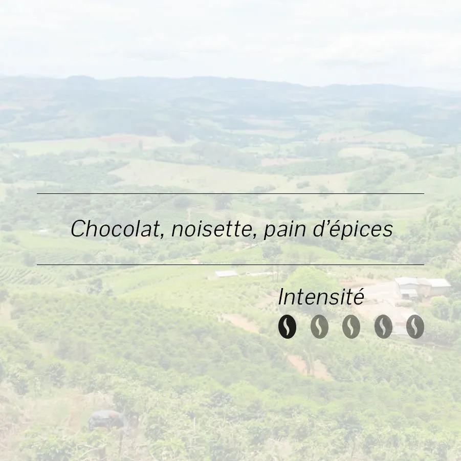 En tasse, attendez-vous à un café somptueux et harmonieux. Ses notes distinctes se déploient avec élégance, révélant des arômes de chocolat réconfortant, de noisette grillée et d’une pointe chaleureuse de pain d’épices. Cette combinaison crée une symphonie de saveurs qui enveloppe le palais et laisse une sensation agréable et durable.