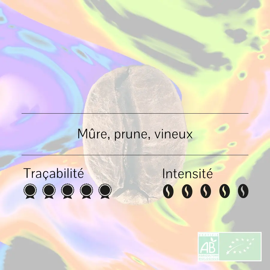 Ce Bourbon Rose explose en bouche avec une intensité maximale 5/5. Les notes de mûre, prune et vineux dominent le profil. Elles révèlent la richesse du process nature et du terroir colombien.