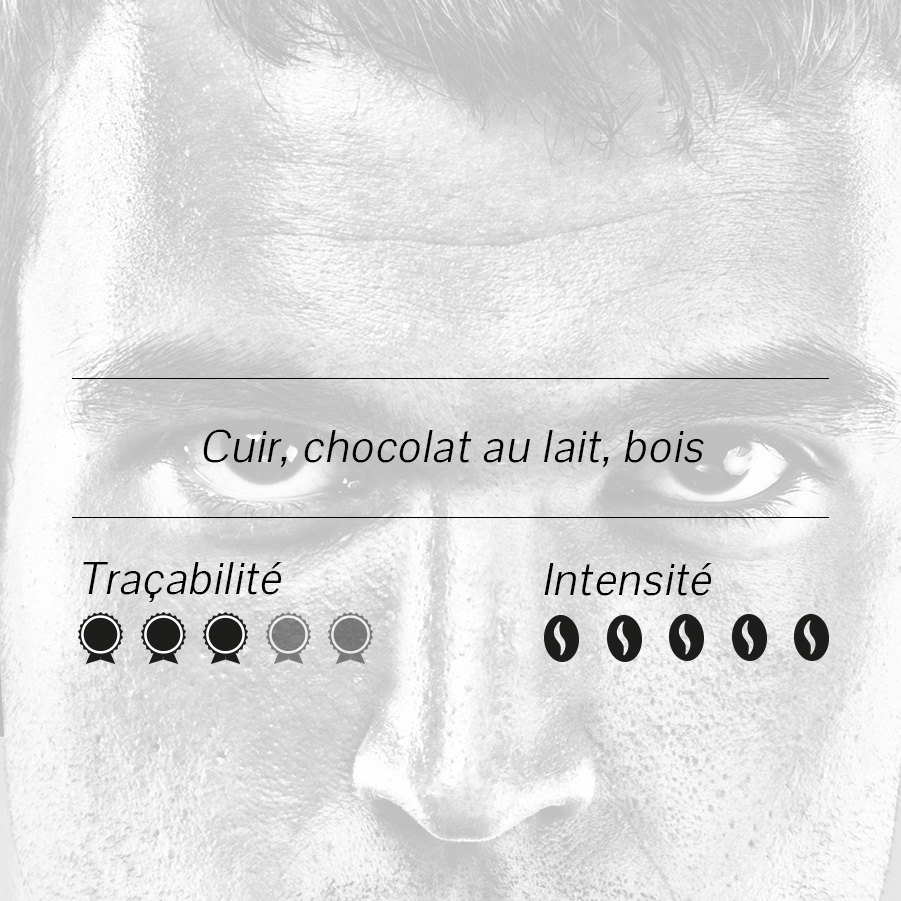 Sa persistance aromatique est remarquable, garantissant une longueur en bouche exceptionnelle. Les saveurs de cuir, chocolat au lait et bois persistent agréablement après la dégustation, prolongeant le plaisir et laissant une empreinte mémorable. Malgré son intensité affirmée, ce café est conçu pour être accessible et équilibré, offrant une expérience puissante mais harmonieuse.