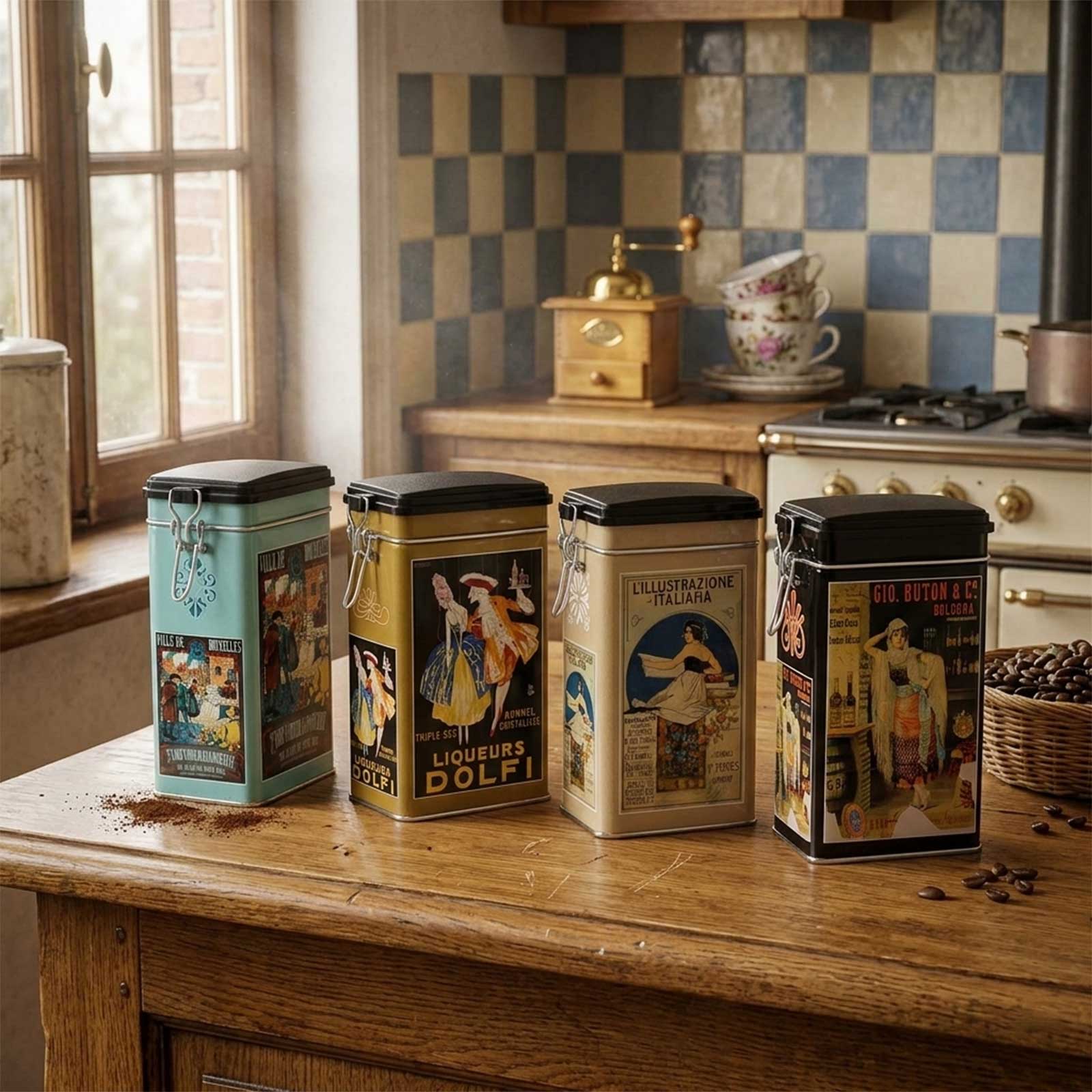 Ces designs transforment votre coin café en galerie rétro. Chaque boîte devient objet de conversation, pièce de décoration à part entière. Les amateurs de vintage et de café trouvent ici leur bonheur. Collectionnez les quatre modèles pour un ensemble harmonieux et authentique.
