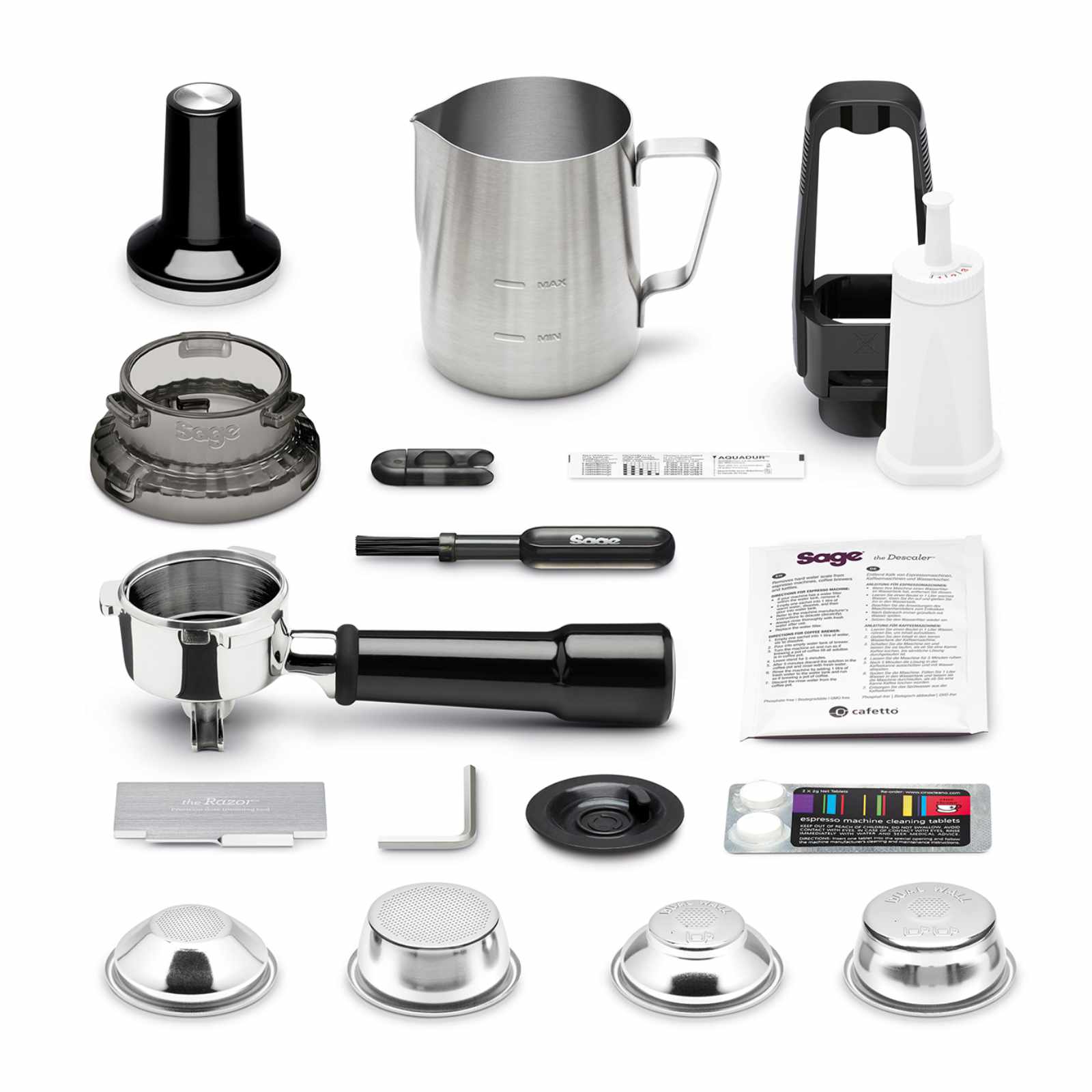 La machine livre un kit complet : pichet à lait en acier inoxydable de 480 ml, paniers-filtres simple et double, support filtre à eau, outil de dosage de précision Razix™, pastilles de nettoyage, poudre détartrante et brosses. Aucun achat supplémentaire n’est nécessaire pour commencer.