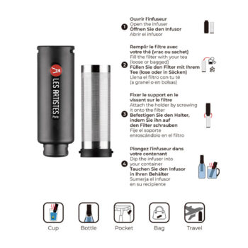 L’infuseur se compose de deux parties : un filtre metallique dôté d’un petit tamis en inox et un support. Facilement transportable, pratique, discret et innovant, il a été conçu pour répondre à un besoin précis : infuser son thé en toute circonstance, en tout lieu, à tout moment, et à emporter.