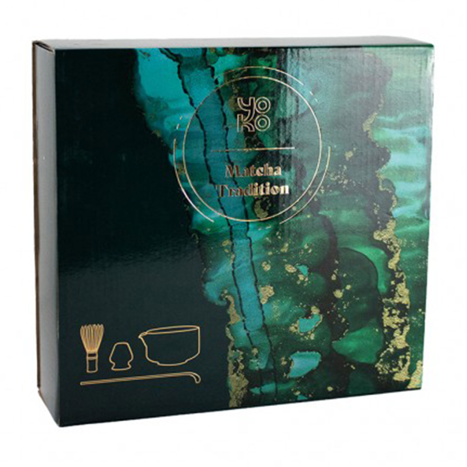 Ce coffret se présente dans un emballage d’une grande élégance, arborant des teintes profondes de vert émeraude et de noir, rehaussées de touches dorées scintillantes qui évoquent la préciosité du contenu. Vous y trouverez le Chashaku, une cuillère en bambou conçue pour doser précisément le thé matcha ; le Chasen, un fouet en bambou fait main, essentiel pour obtenir une mousse onctueuse ; le Matchawan, un bol en céramique de 400 ml idéal pour fouetter et déguster ; et enfin, le support de fouet, garantissant la bonne conservation du Chasen. Des pictogrammes dorés sur l’emballage illustrent ces instruments, soulignant l’authenticité de l’expérience proposée.