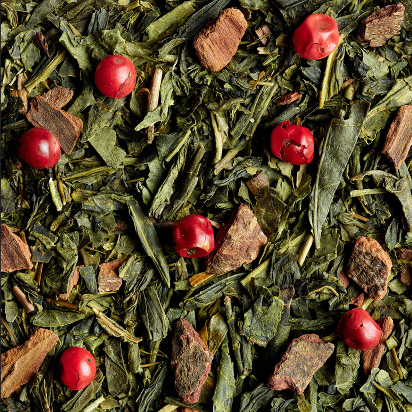 Plongez au cœur des festivités avec ce mélange de thé vert qui éveille les sens et l’esprit de Noël. Dès le premier regard, il offre une composition visuelle riche : des feuilles de thé vert aux reflets profonds et torsadés, parsemées de baies rouges vives et de morceaux d’écorce brune. Cette harmonie de couleurs et de textures annonce déjà la richesse des saveurs à venir, où la fraîcheur du thé rencontre la chaleur des épices.