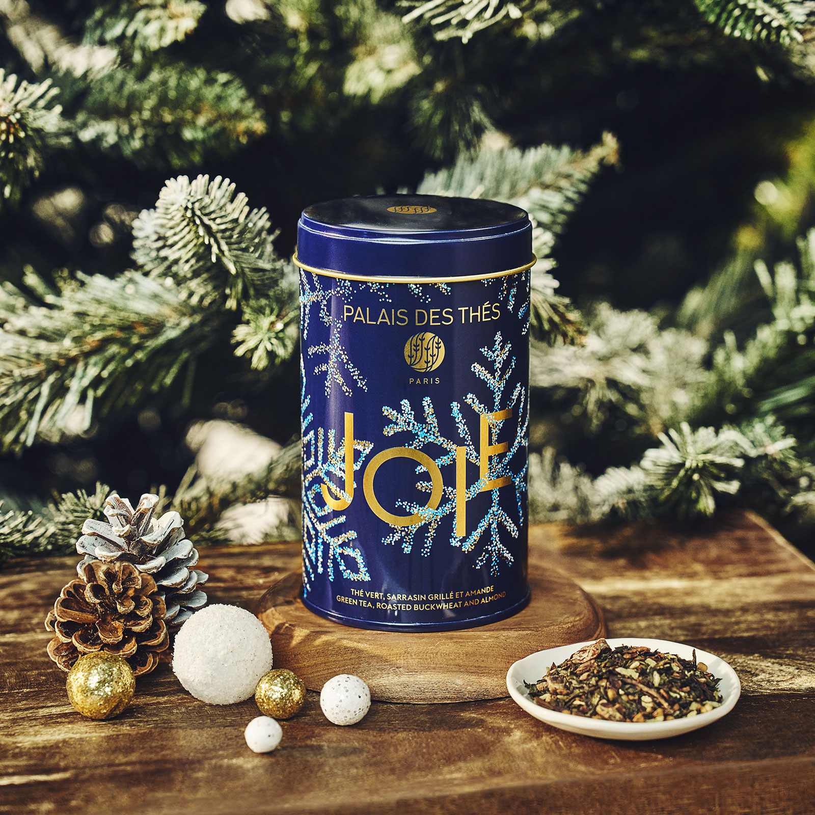Le thé Joie est présenté dans une magnifique boîte en métal. Sa couleur bleu nuit intense est rehaussée de flocons blancs et or scintillants. Le logo Palais des Thés Paris et le mot JOIE sont inscrits en lettres dorées. Ce design élégant évoque parfaitement l’ambiance des fêtes hivernales. Il apporte une touche raffinée à votre intérieur.