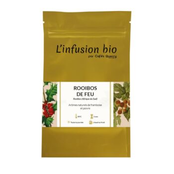 Ingrédients : Rooibos* et Honeybush* d’Afrique du Sud, arômes naturels de framboise* et poivre