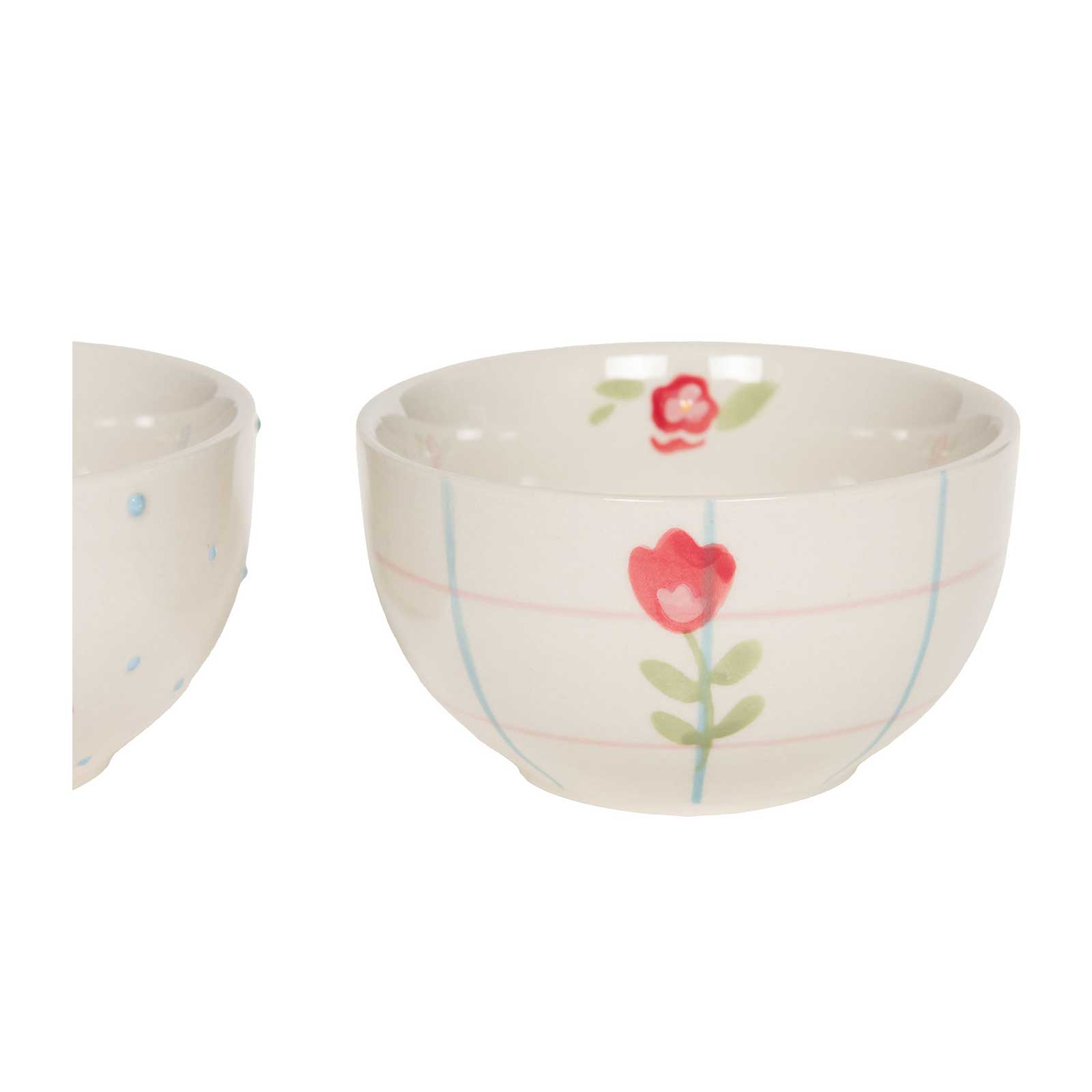 Le bol propose deux décors floraux distincts : un bouquet multicolore avec points bleus, une tulipe rouge sur carreaux rose et bleu. Ces motifs évoquent la douceur des jardins de campagne. Les teintes pastel (blanc cassé, rose, bleu, vert) créent une atmosphère chaleureuse et poétique.