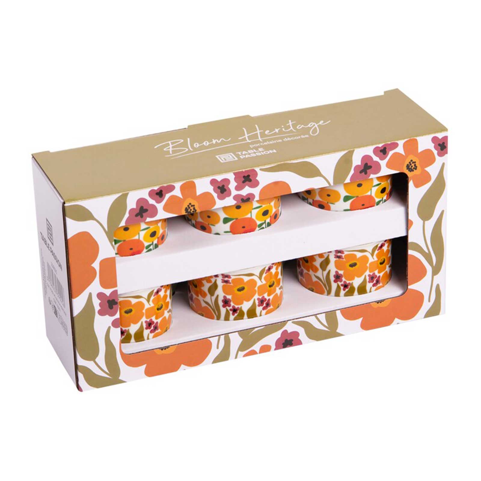 Ce coffret réunit 6 tasses en porcelaine de la collection Bloom Héritage de Table Passion. Chaque tasse arbore des motifs floraux éclatants inspirés des champs en fleurs. Les designs alternent entre teintes chaudes d’orange et jaune, et touches délicates de rose et vert.
