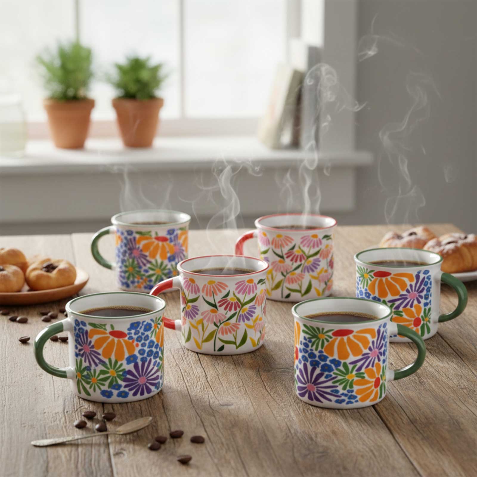 Ce coffret complet contient 6 tasses parfaitement assorties. Elles permettent de servir toute la famille ou des amis simultanément. Les designs variés créent une table harmonieuse et colorée. C’est un ensemble cohérent et généreux.
