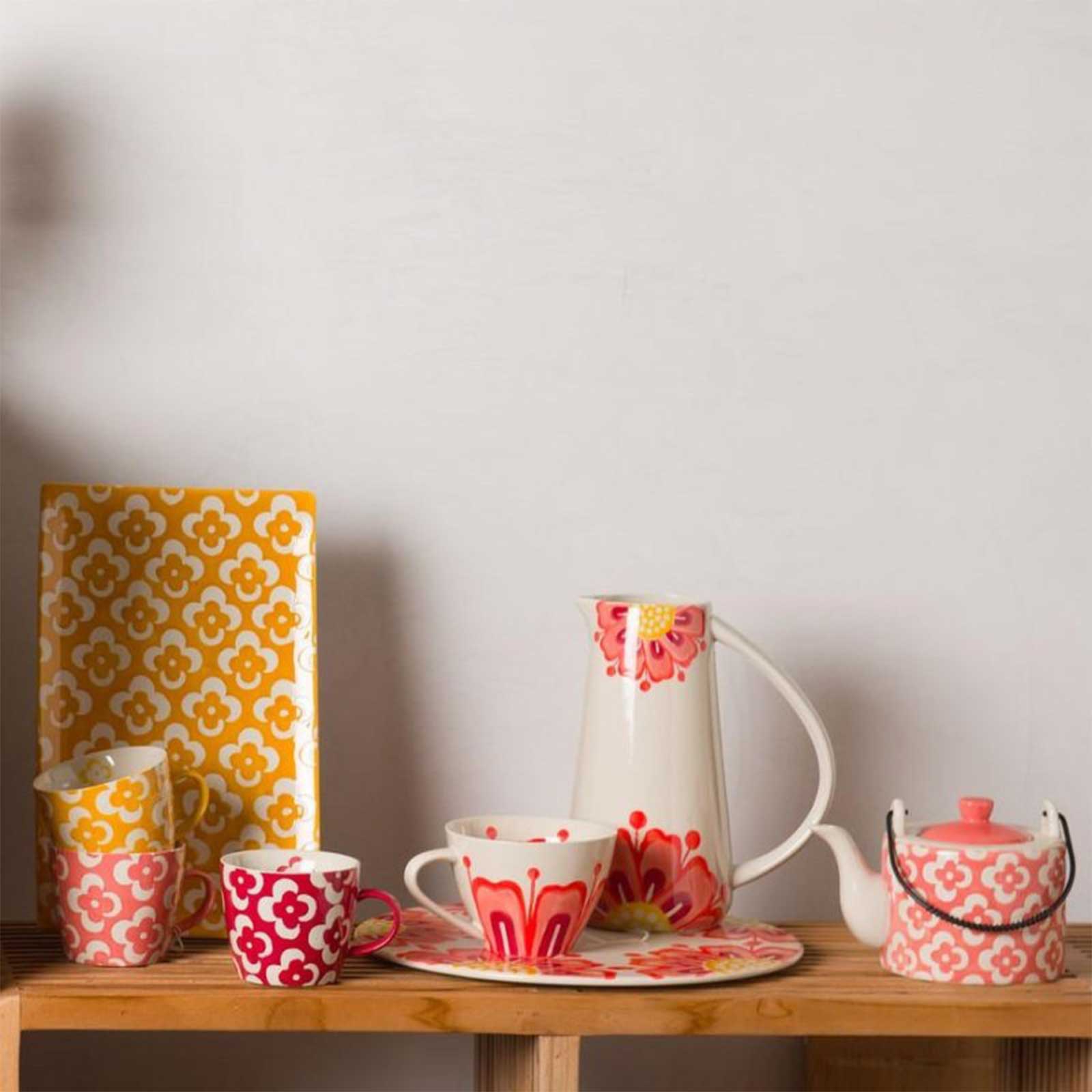 Le motif floral stylisé orne la tasse avec élégance intemporelle. Les nuances de rouge et rose se détachent sur un fond beige chaleureux. Ce design évoque une fleur peinte à la main, apportant caractère et poésie.