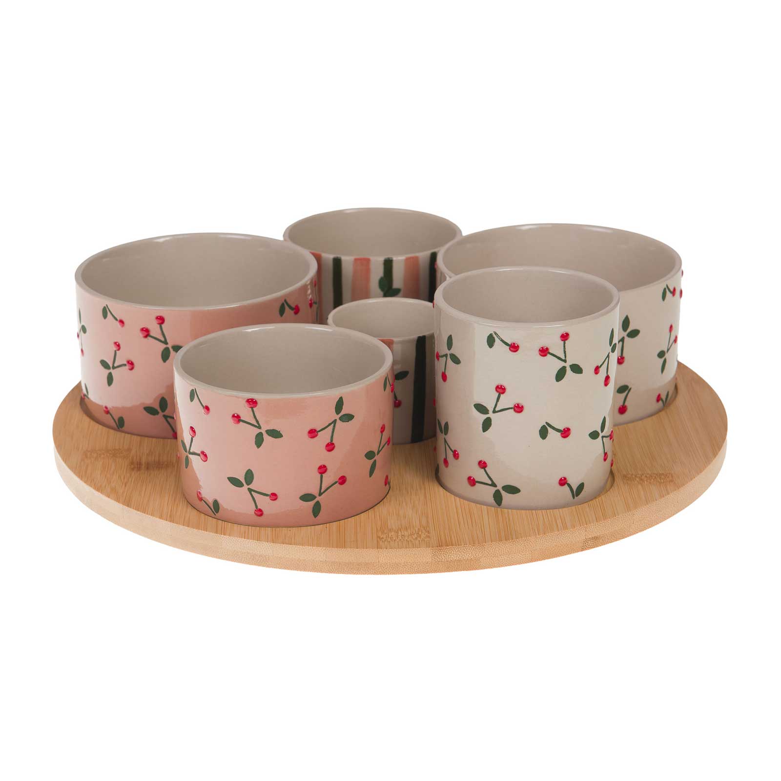 Ce coffret réunit 6 bols en grès et un plateau en bois dans une présentation harmonieuse. Trois bols affichent un motif de cerises rouges sur fond rose poudré. Les trois autres présentent des rayures verticales en rose, vert et crème. Chaque pièce s’accorde parfaitement avec les autres.