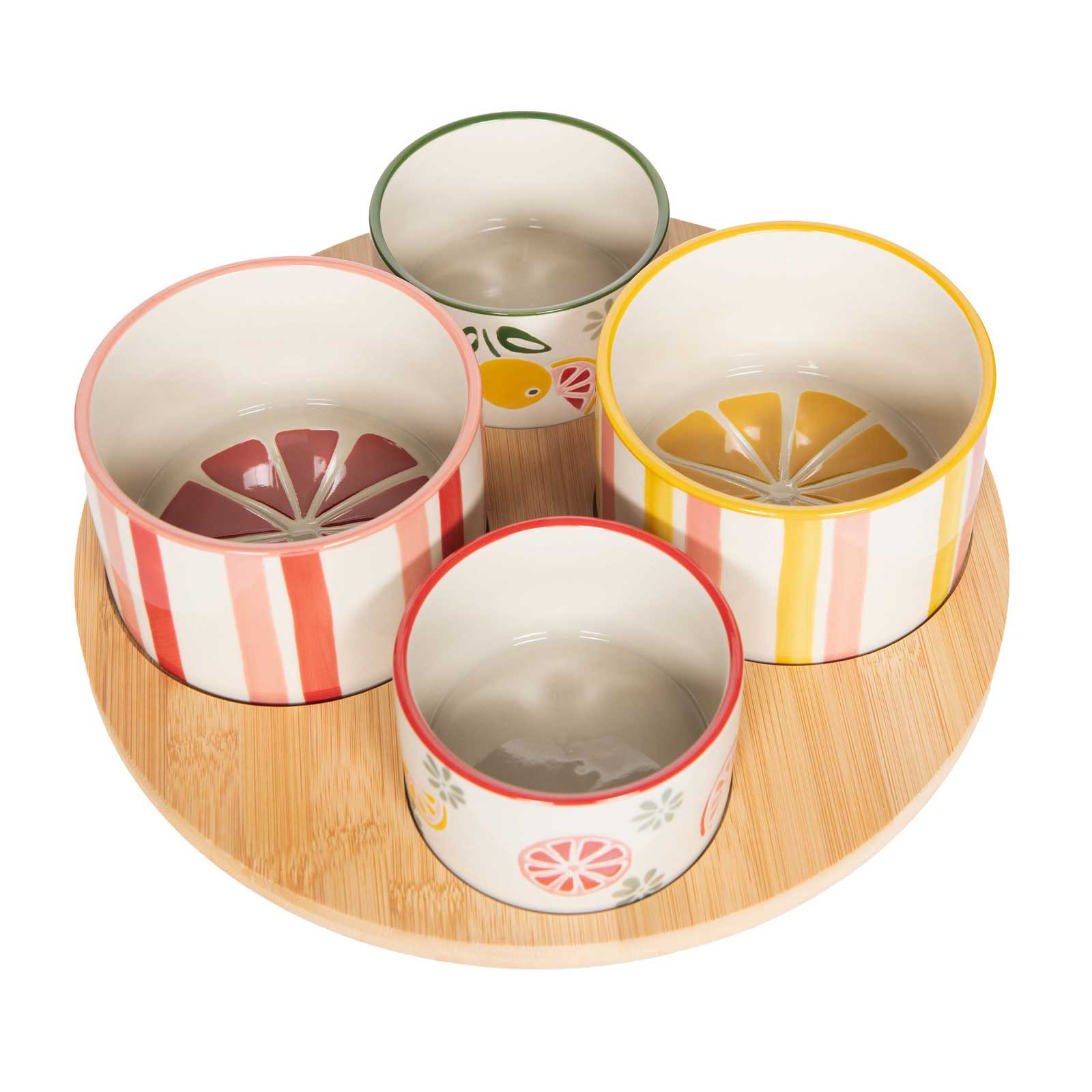 Ce coffret Amadeus Zestine réunit un plateau rond en bois naturel de 30 cm de diamètre. Il s’accompagne de 4 bols en grès aux décors coordonnés et variés. L’ensemble crée une présentation élégante et harmonieuse.