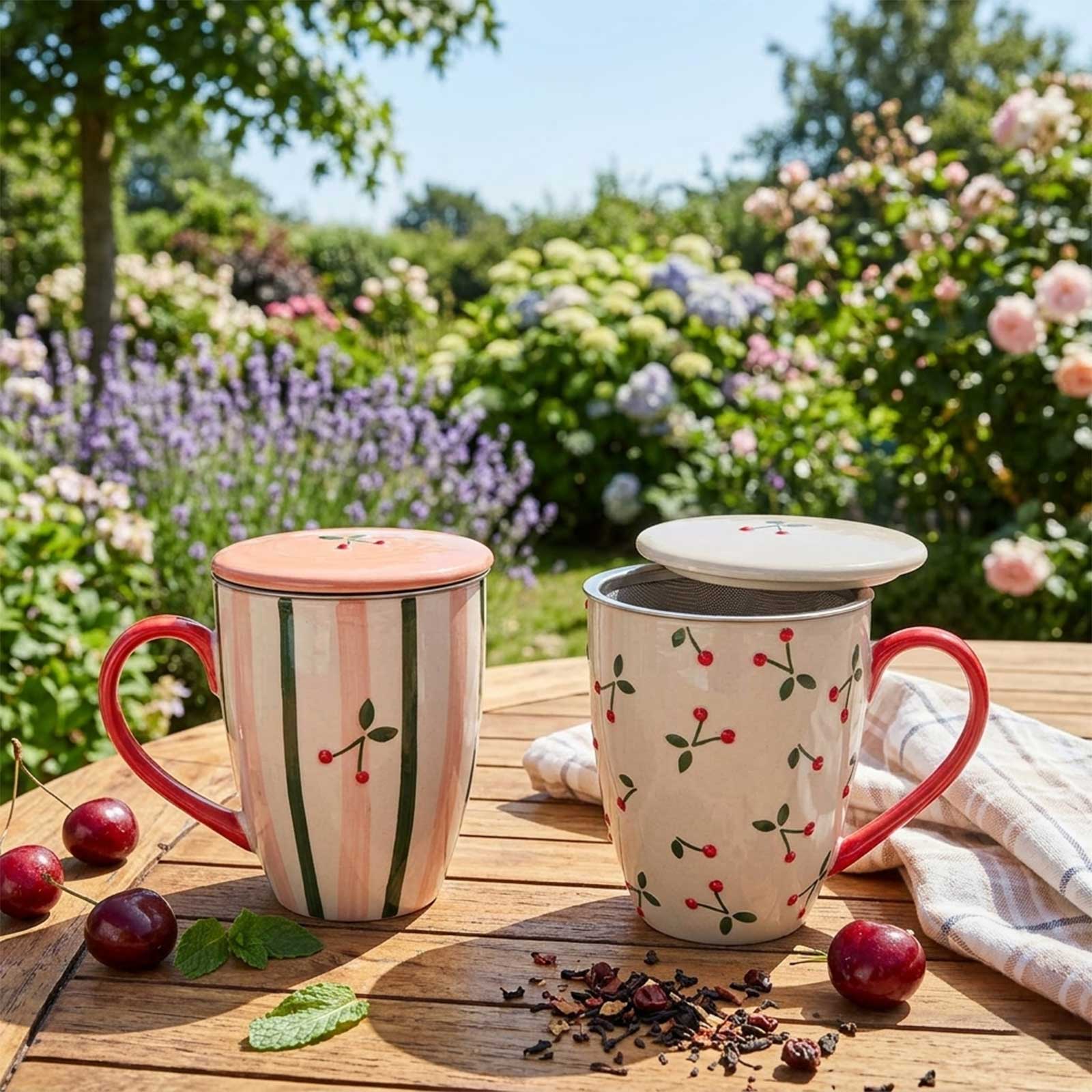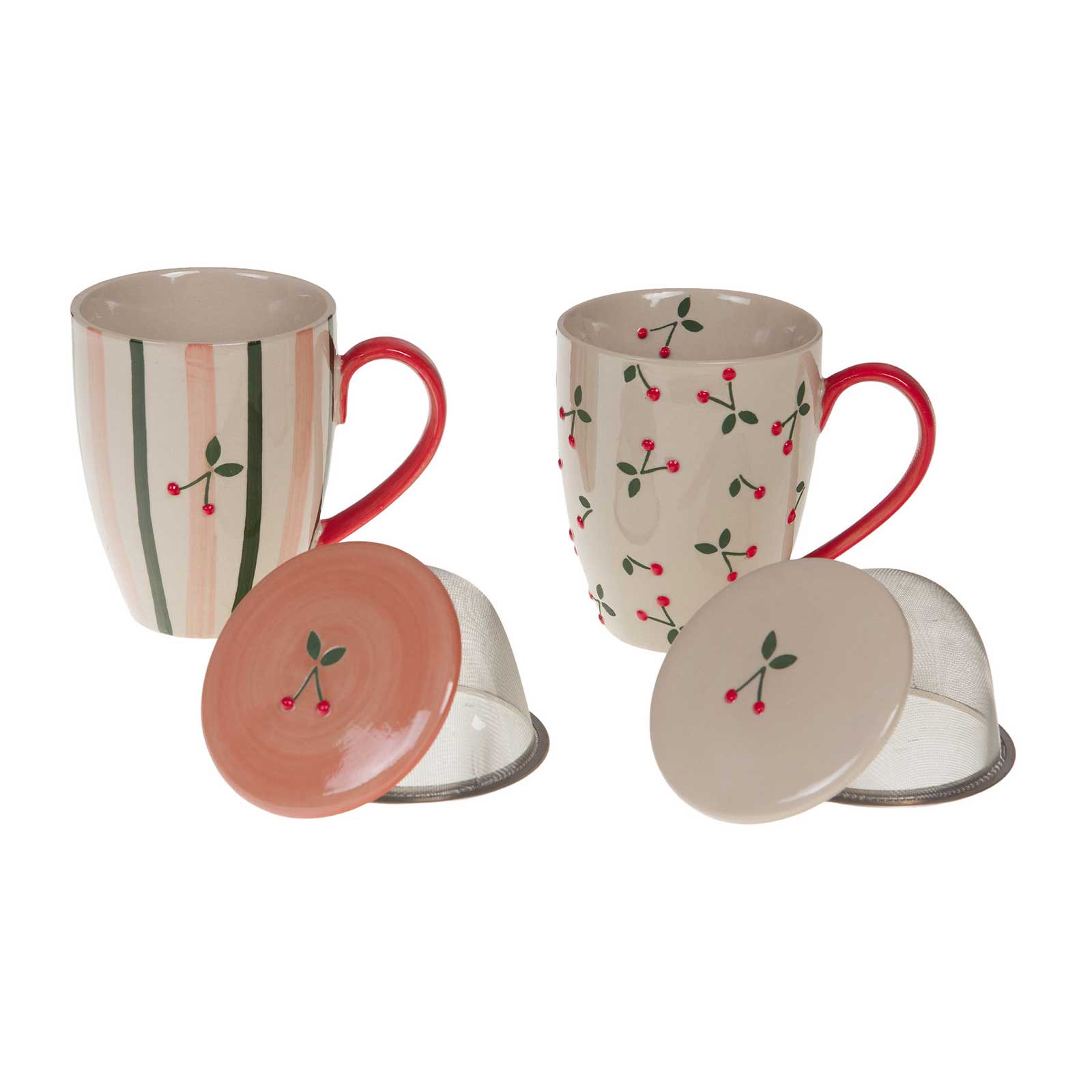 Cet ensemble réunit deux mugs aux designs différents mais harmonisés. Le premier affiche des rayures verticales roses et vertes agrémentées de cerises. Le second présente un motif répété de cerises rouges. Les couvercles asortis complètent chaque modèle.
